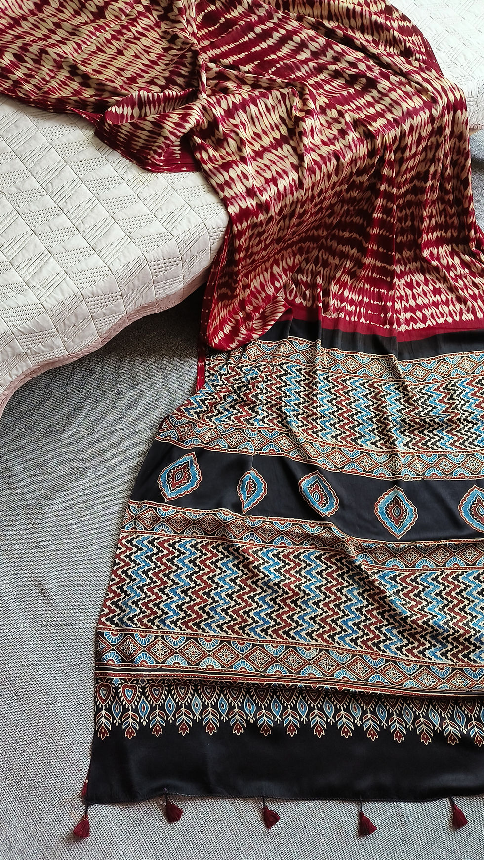 Shibori Ajrakh Modal Silk Saree MaroonBlack